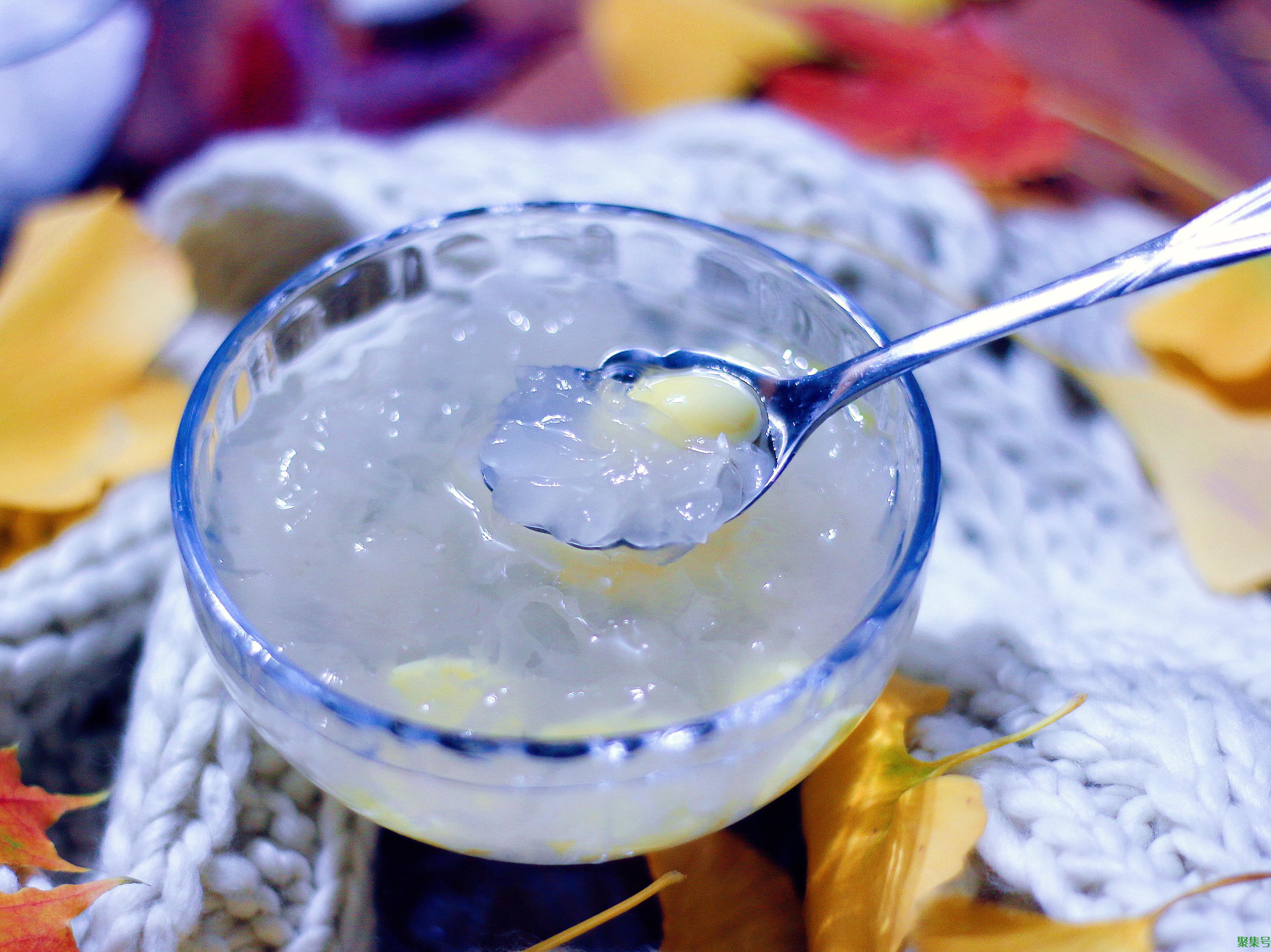 做法:将银耳泡水30分钟,淘洗后去根,撕成小朵。白果去壳,去胚芯,和银耳、冰糖一起倒入小锅中,加适量水,中火熬煮30分钟,到银耳起胶即可。