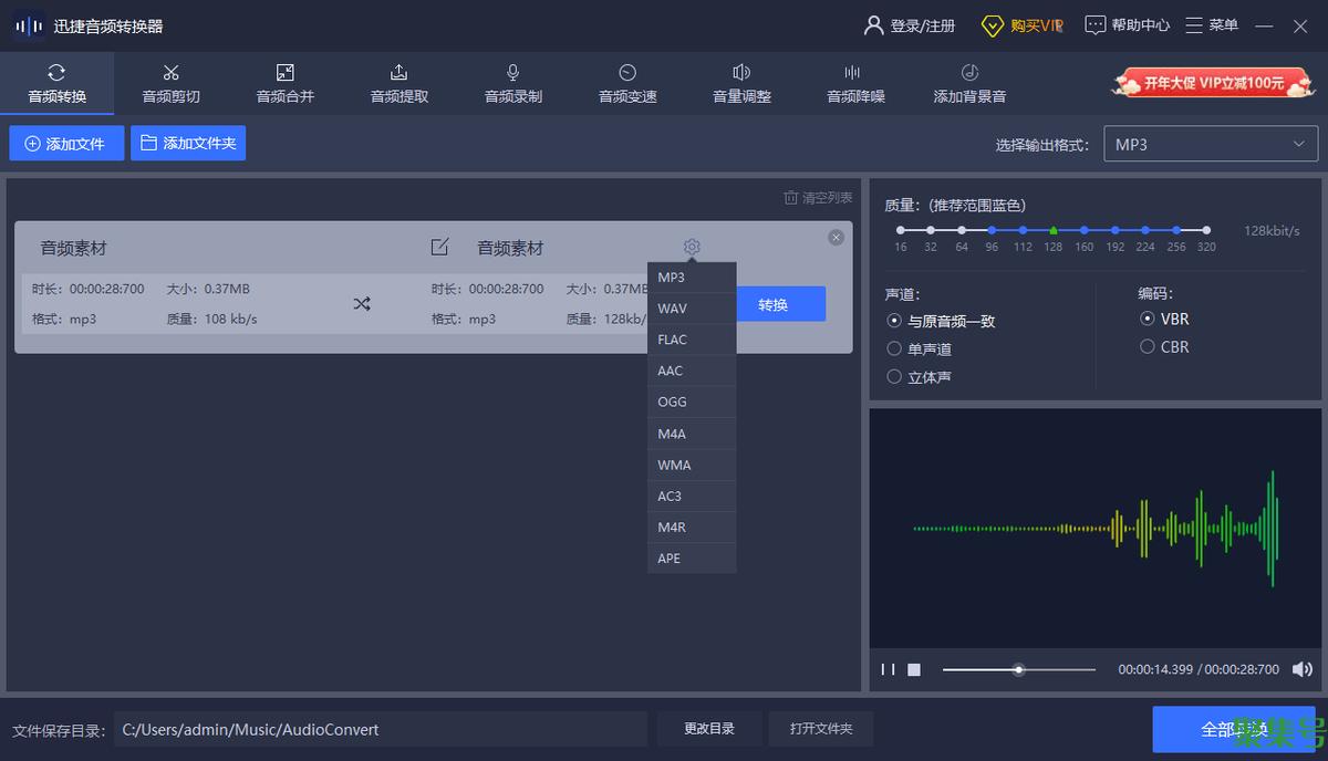还有这个音频转换功能,可以自由转换音频的格式、声道、编码、质量调整。