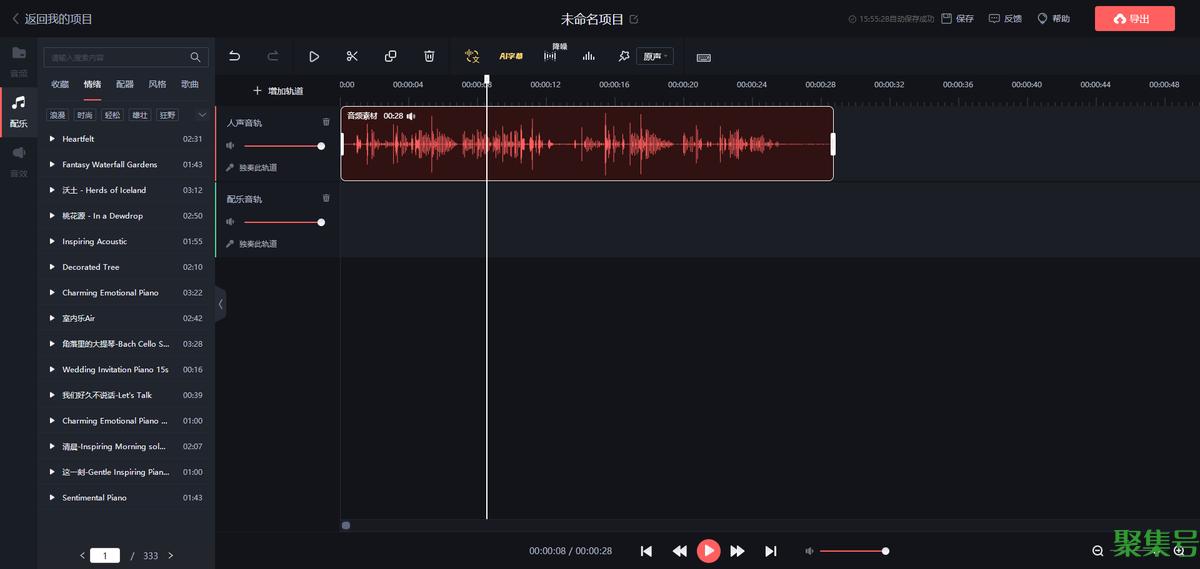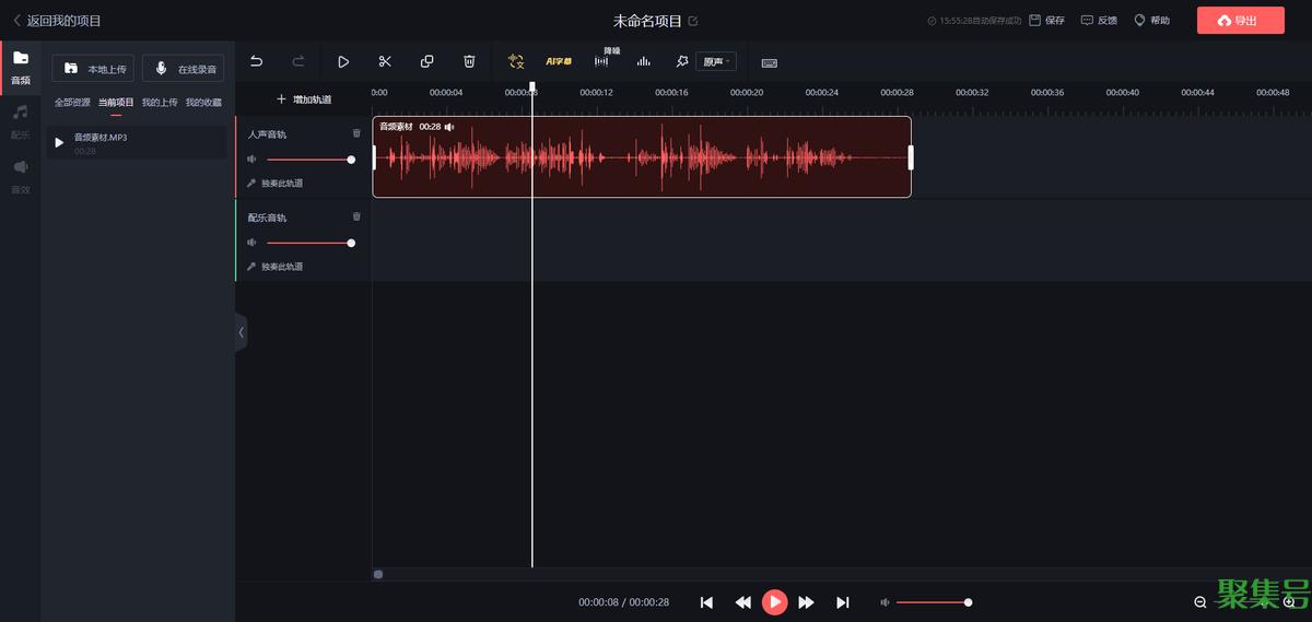 这款工具的音频剪辑功能还是相当齐全的,并且具备人声、配音双轨道,可以进行分割、复制=删除、降噪、调音等编辑处理。