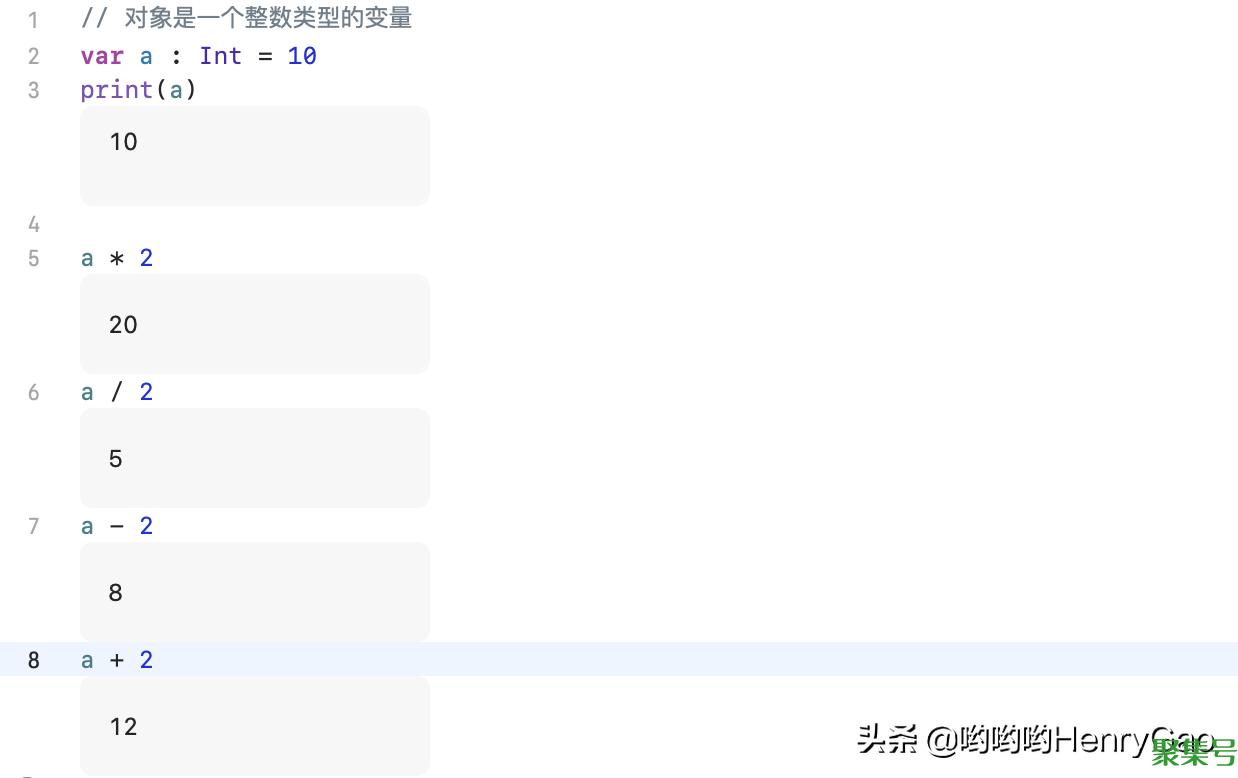 // 对象是一个整数类型的变量var a : Int = 10print(a)a * 2a / 2a - 2a + 2