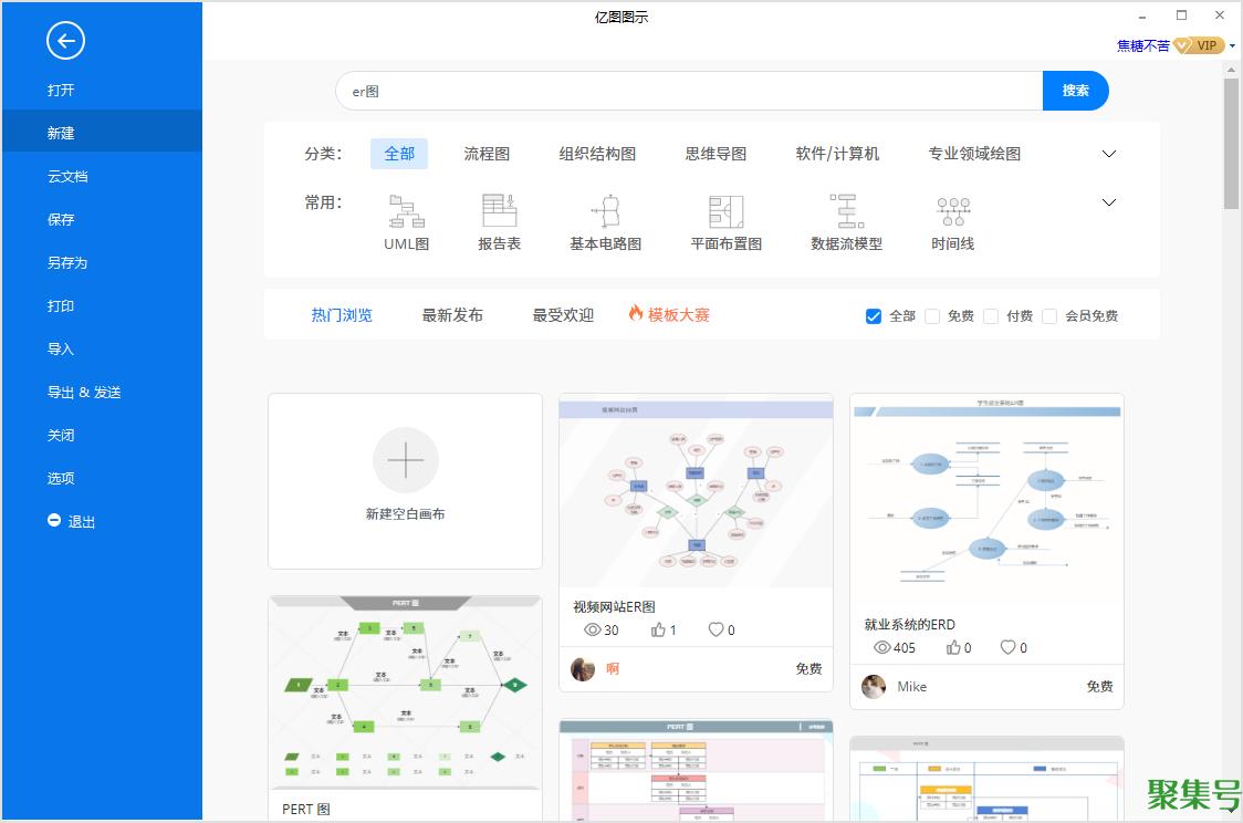 第二步:新建er图。直接在搜索框中搜索“er图”,在下方的例子库中,选择一个er图模板,点击使用模板。