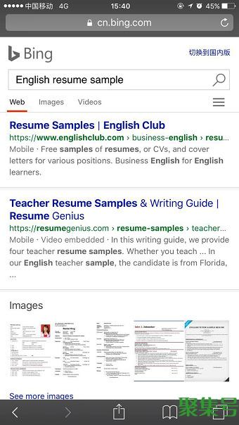 早在几个月前,小编就发现苹果设备上的默认搜索引擎是必应,并且就常常出现“仅英文结果”的搜索选项,点击后常常有更加精准与令人惊喜的结果。在必应的国内版和这次上线的国际版中,小编都试了搜索“English resume sample”,国内版的bing会提示输入了英文,建议切换到国际版。从国际版的搜索体验上看,页面一贯的整洁美观,链接里面的内容确实实用,真的是英文搜索用户者的福音啊。