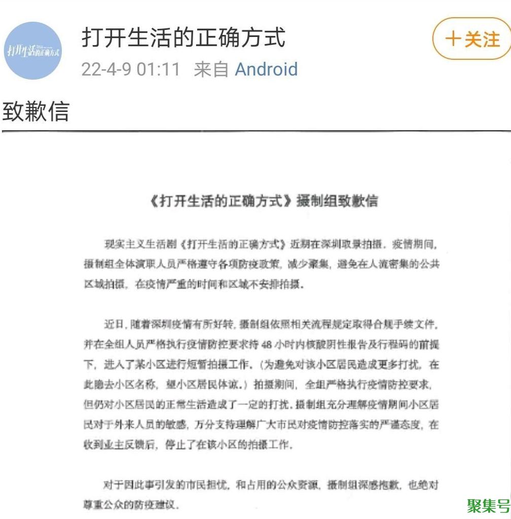4月9日,电视剧《打开生活的正确方式》摄制组发布致歉信,向此前所在拍摄小区业主致歉。致歉信中表示,剧组拍摄是在取得合规手续文件、全员持48小时内核酸阴性报告及行程码的前提下进行。在收到业主反馈后,停止了在该小区的拍摄工作。