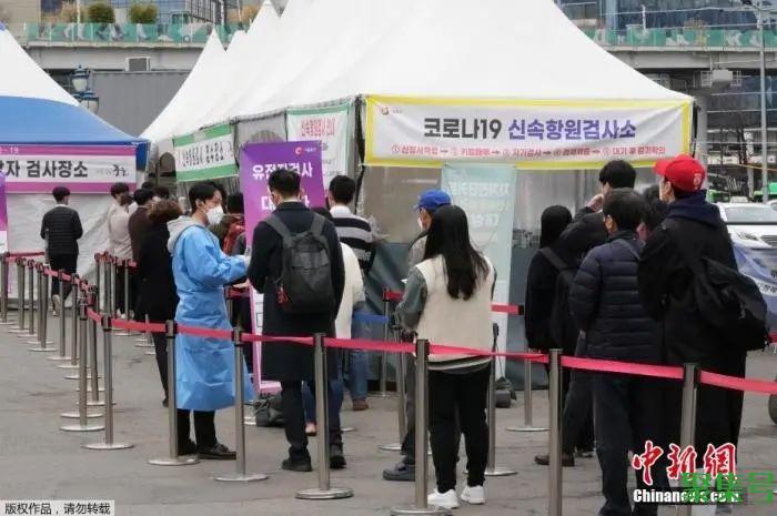 资料图:当地时间2022年3月17日,一名医务人员在韩国首尔的一个临时检测点指导等待新冠病毒检测的人。