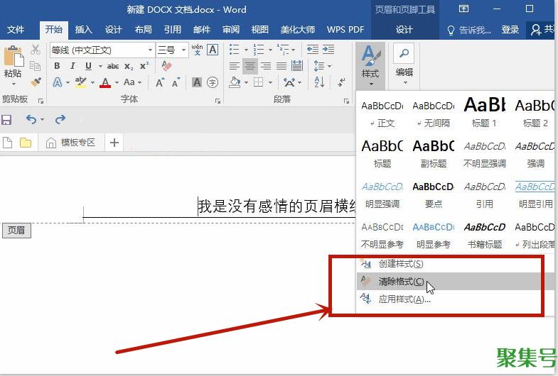 首先将鼠标放在页眉线上,然后点击上方栏目里面的【样式】一栏这样简单的删除格式之后,就能将烦人的横线删除。