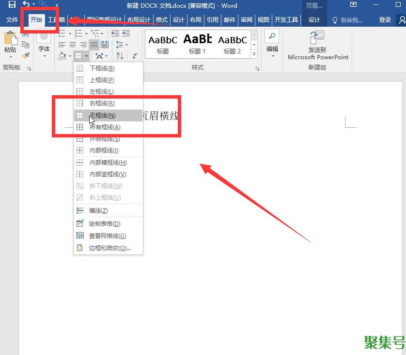 选中页眉横线上的文字,然后点击【开始】页面,在【边框】一栏里面,继续向下查看,然后选择【无边框】一栏。