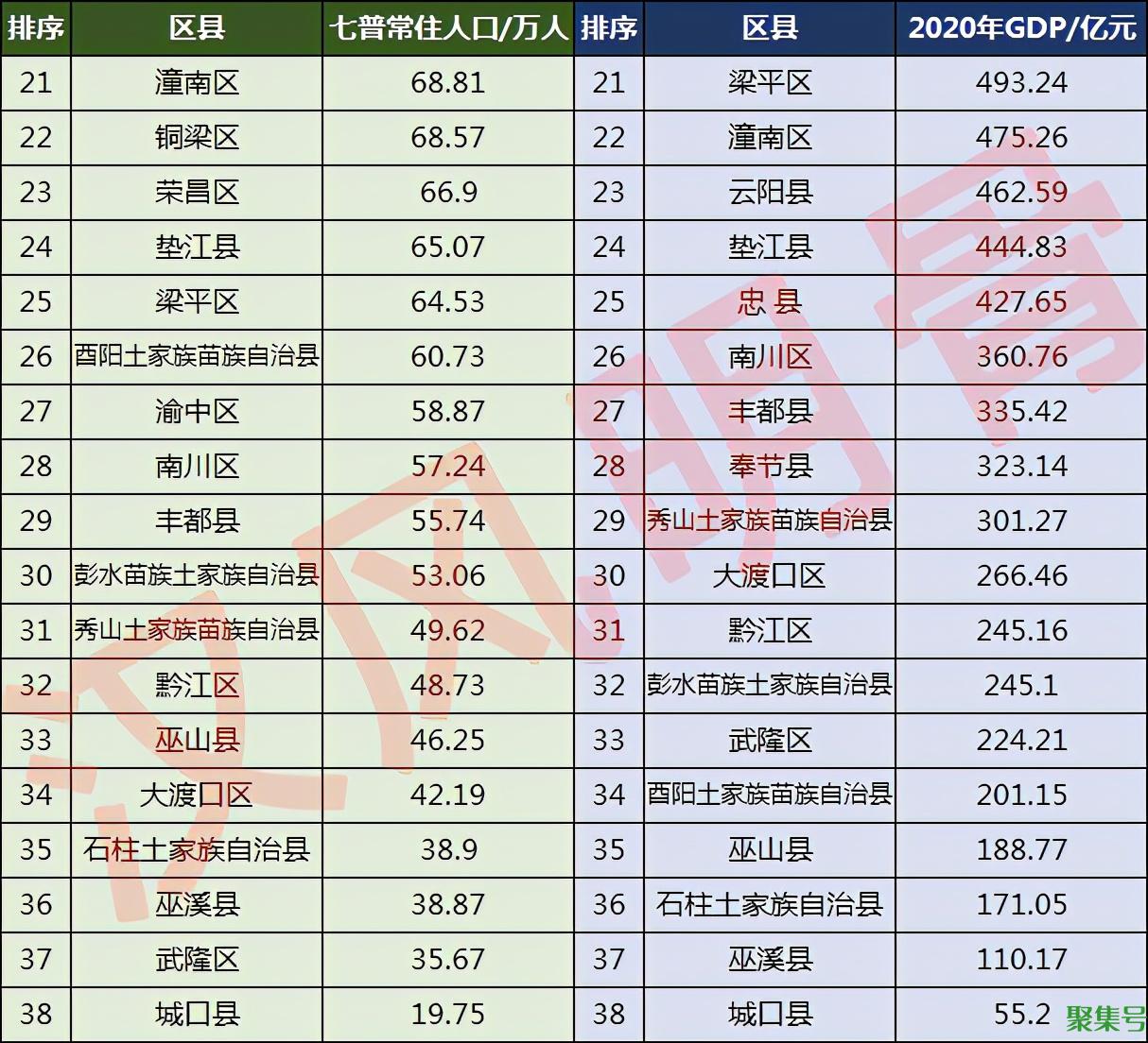 重庆市下辖26个区、8个县、4个自治县共计38个县级行政区,以下为重庆38个区县的人口分布情况: