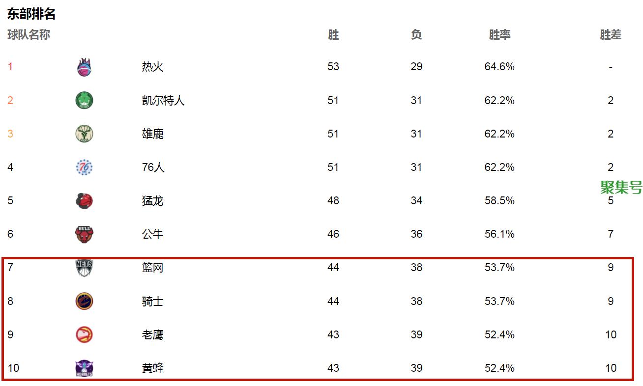 先来看东部的排名,位列7-10名的球队分别是篮网、骑士、老鹰、黄蜂,从球队胜利场数依次是44、44、43、43非常的接近,四支球队参加附加赛一点也不吃亏。从东部球队的排名来看也增加了比赛的不确定性和趣味性。
