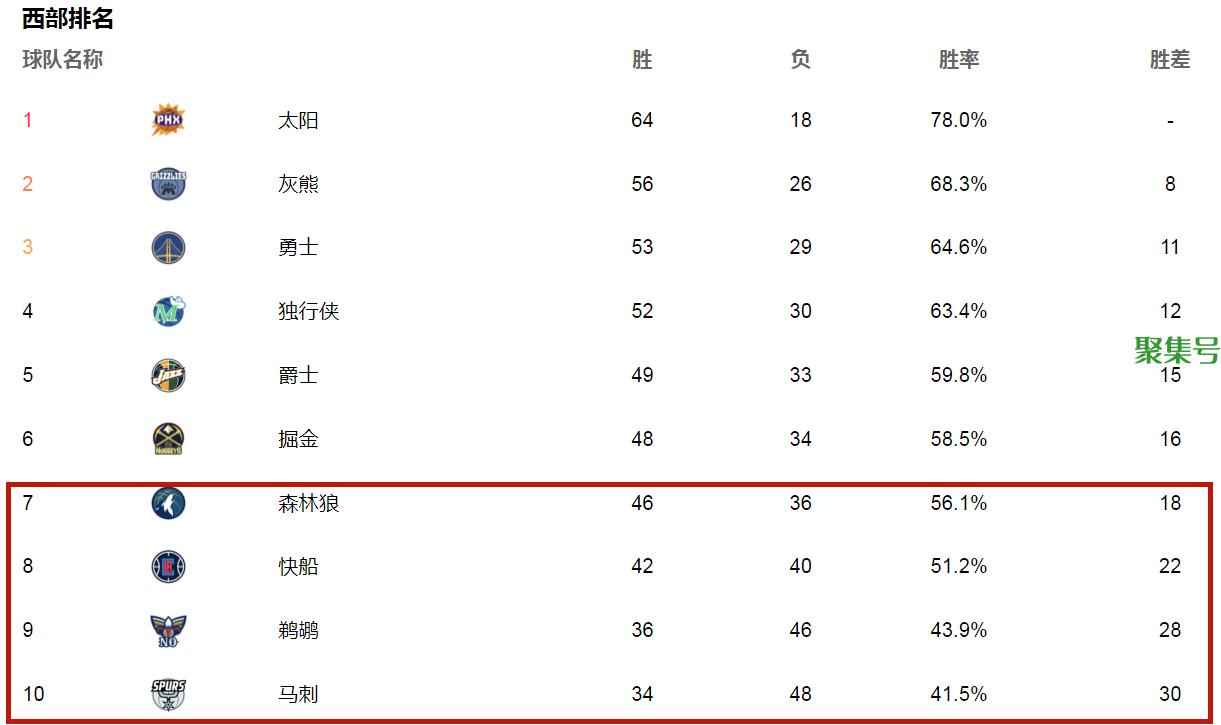 再来看西部的排名,位列7-10名的球队分别是森林狼、快船、鹈鹕、马刺,从球队胜利场数依次是46、42、36、34相差比较大。尤其是位列第7的森林狼队,虽然领先位列第8的快船队2个胜场并不是很大,但是领先位列第9的鹈鹕队10个胜场!森林狼队战绩在东部是可以直接晋级季后赛,不需要参加附加赛,可见西部球队两极分化真的很严重,排名低的球队竞争也很激烈!附加赛的规则从西部球队来看,又不是那么的合理!