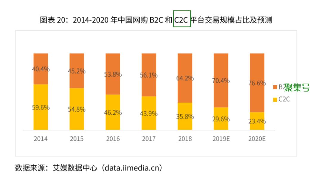 此案例指的是,在中国网购的平台中,C2C平台的交易规模占比为35.8%,远低于B2C平台的交易规模。(以2018年的数值作为参考,其他同理)