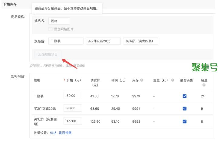 而且多规格的产品,不能添加&删除原来的规格属性,只能追加对应的属性值。