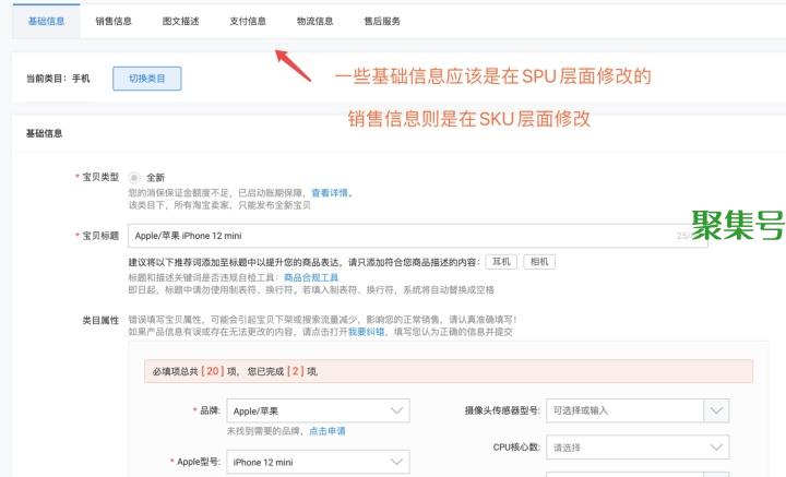 如果我将所有的编辑都放在SKU层面,那么我自然而然可以编辑一些“基础信息”、“非关键属性”、“销售信息”等。