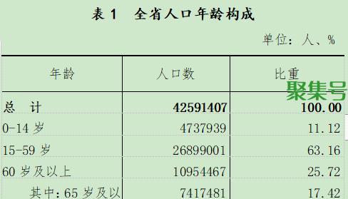 全省人口[2]中,0-14岁[3]人口为4737939人,占11.12%;15-59岁人口为26899001人,占63.16%;60岁及以上人口为10954467人,占25.72%,其中65岁及以上人口为7417481人,占17.42%。同2010年第六次全国人口普查相比,0-14岁人口的比重下降0.3个百分点,15-59岁人口的比重下降9.99个百分点,60岁及以上人口的比重上升10.29个百分点,65岁及以上人口的比重上升7.11个百分点。