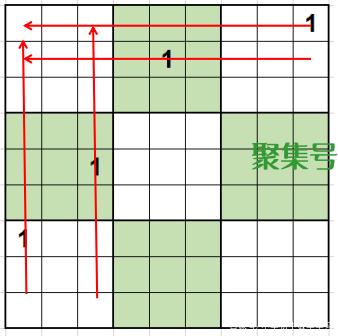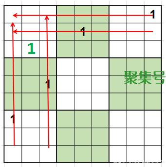 从上图我们可以发现,将出现的四个1按照所在的行和列进行延伸,4个1都延伸会合于第一宫。