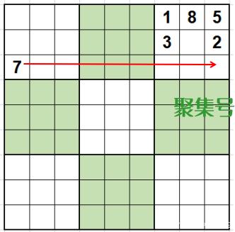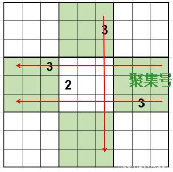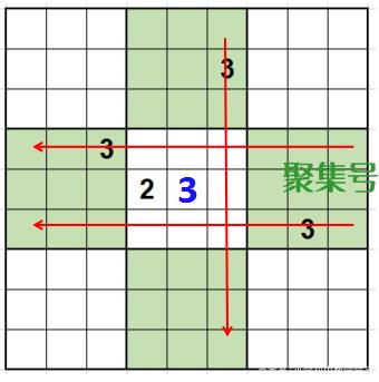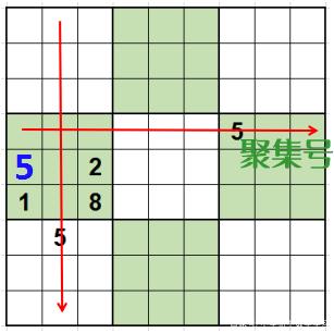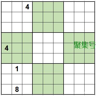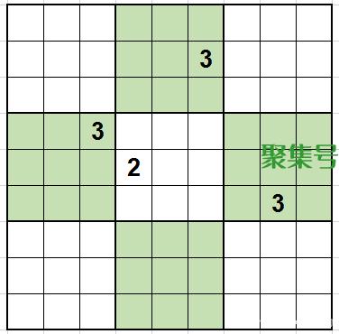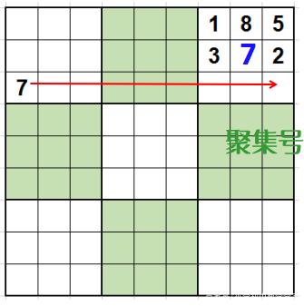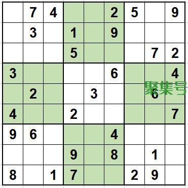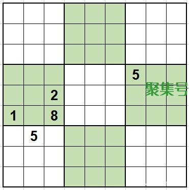 九宫数独中只出现了三个3,将这三个3所在的行和列衍生会合,发现它们会合于第五宫。
