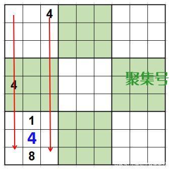 九宫数独中只出现了两个4,将这两个4所在的行和列延伸会合于第七宫。