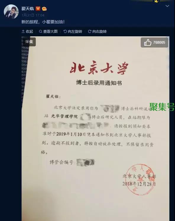 澎湃新闻注意到,2018年12月14日,北京大学博士后办公室通过官网发布了《北京大学2019年1月拟进站博士后名单公示》,该公示日期为2018年12月14日至2018年12月20日,翟天临位列其中,根据后续通报,他最终通过公示。