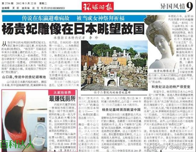 说来也是奇怪,后来在日本发现了两座杨贵妃墓,而且还有杨贵妃的塑像,以至于人们开始怀疑当时唐 玄宗并没有赐死杨贵妃。而在日本《杨贵妃复活秘史》一文中考证说,当年唐玄宗舍不得杀死杨贵妃就 让杨贵妃的一个丫鬟替她死了,后来杨贵妃随遣唐使去了日本。到日本后杨贵妃受到天皇热诚接待,而 杨贵妃还帮助天皇挫败了一次宫廷政变,从此在日本名声大震,获得日本人民,尤其是日本妇女的好感 。在日本人,至今还有日本妇女说她是杨贵妃的后代。