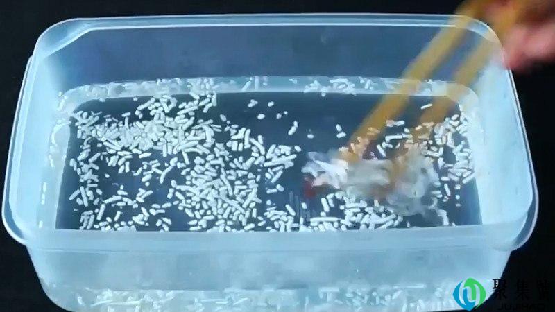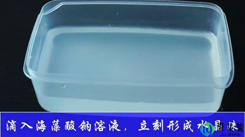 6、滴入海藻酸钠溶液,可立刻形成水晶珠,在氯化钙中放一会儿,即可在水中养了。此外,还可以将海藻酸钠溶液滴入模具中,制作水晶娃娃等。