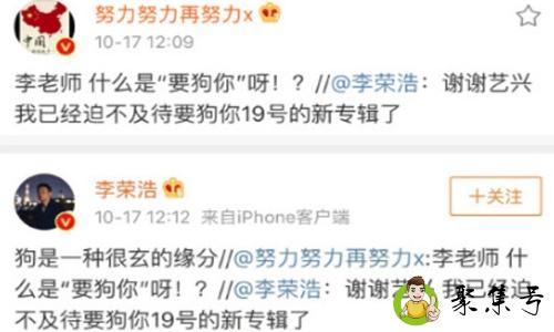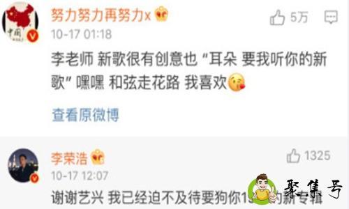 李荣浩在微博上宣布第五张专辑《耳朵》上线,张艺兴就留言称赞新歌。然后李荣浩和张艺兴就很有趣地互动起来了,而李荣浩的一句:我已经迫不及待要狗你19号的新专辑,把张艺兴的兴趣提了起来。