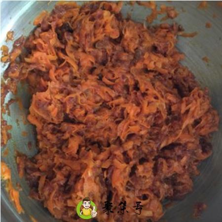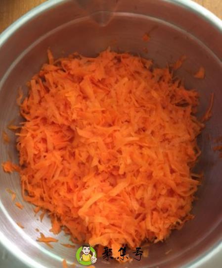 2、胡萝卜擦丝,用刨芝士的刀就可以。放油和盐略炒。