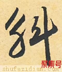 右部“斗”字疏密得当,笔画精准。首先写两个点笔,这里写为“撇点”,可化呆板,使字生动自然,注意写准位置,稍重,注意形态和指向的变化。横笔与左部半虚接起笔,向右抗肩,稍压第二个撇点的收笔,稍呈俯势,收笔稍下拉;最后竖笔高起,竖身靠近点笔,垂直掼下,中间略细,略弯,坚挺有力,到位后垂露收笔。