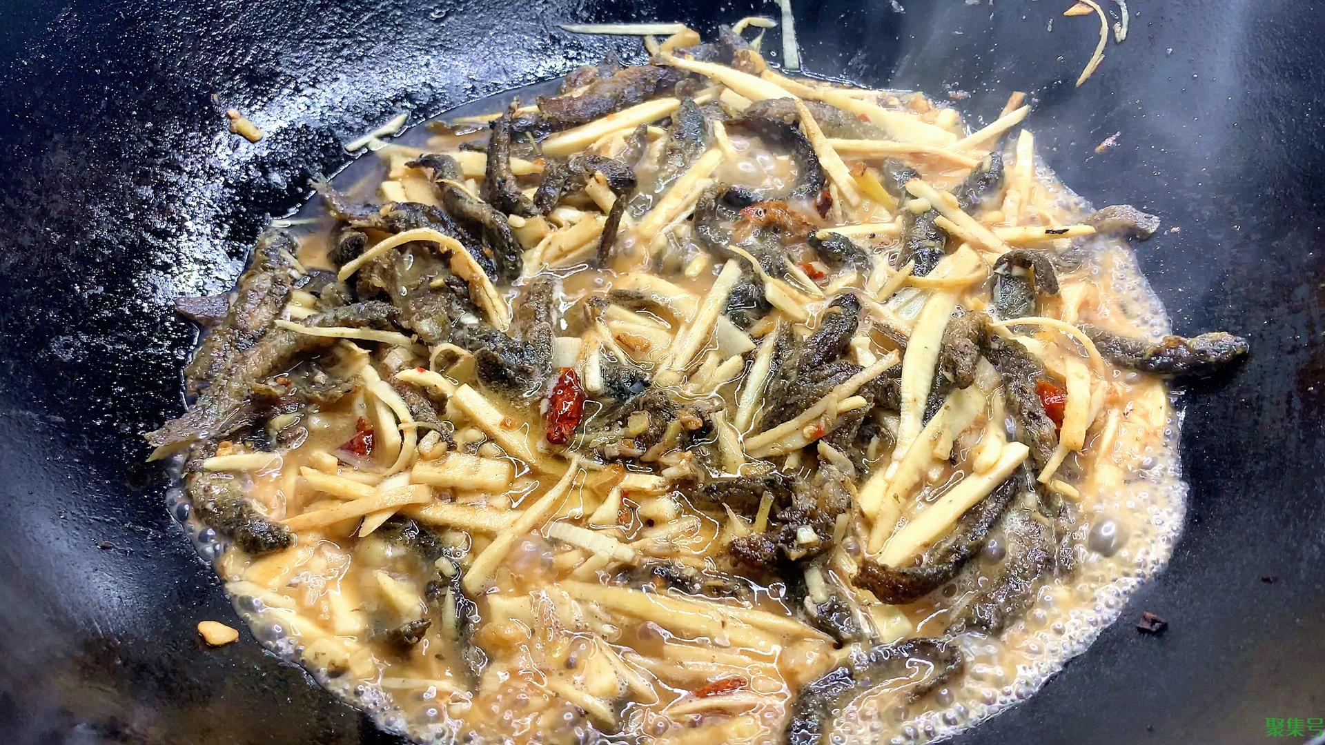 煎干的泥鳅捞出来,锅留底油,下姜蒜末和干辣椒爆香后,下冬笋丝爆炒,炒出水分后,加少量水,加盐和胡椒粉调味,下泥鳅焖煮一会儿,大火收汁,出锅撒上葱花。