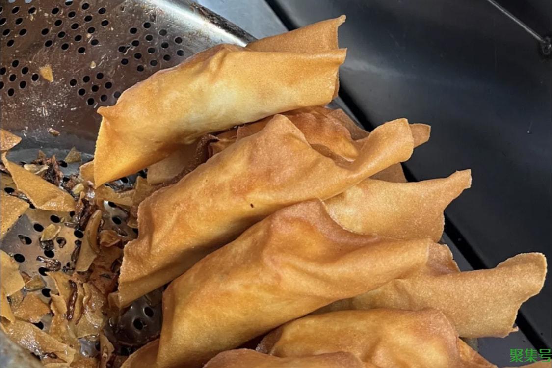 尖头卷圈则是用面皮包裹上调制好的绿豆芽菜馅,讲究的卷圈菜馅中还会加上油面筋、香干、粉皮等,包好后再卷上一层面皮,两头不包呈尖头状,这尖头的卷圈更像是放大版的春卷。