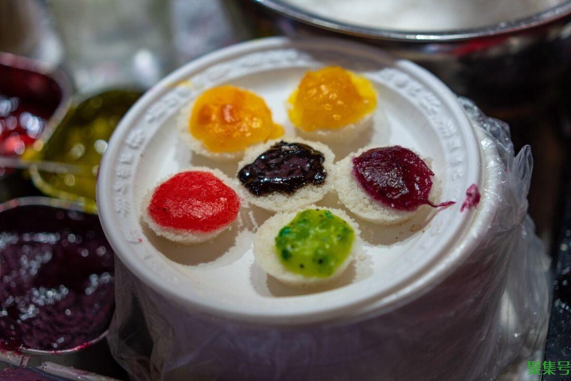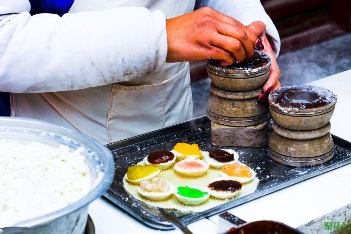 熟梨糕中的梨可不是真的水果梨,这“梨”通“哩”,意思是“熟哩儿”,用大米磨成粉渣,加入甑子里再放到特制的蒸锅汽嘴上蒸熟,一分钟不到,蒸汽就能将熟梨糕顶出来,抹上酸沫膏,也就是酸枣酱,或是豆沙、白糖、红果等酱料,味道甜滋滋的,口感软糯糯的。