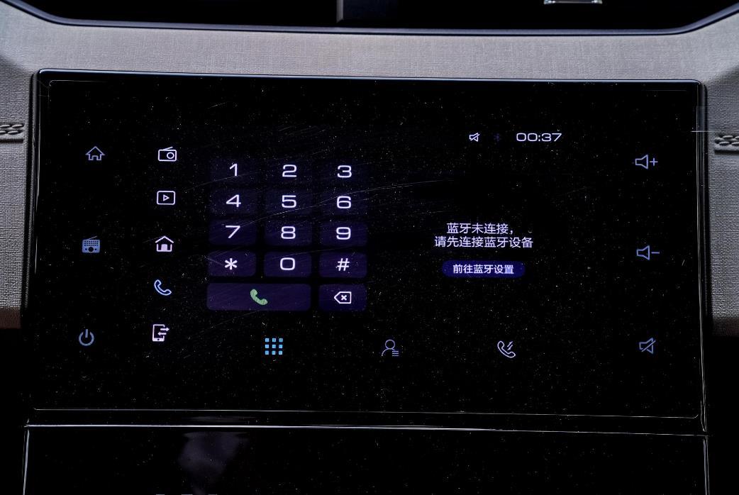进入到前排,中控区域造型简洁规整,有一种硬派越野车的风格,中控屏是8英寸的,用手触控时,菜单反应灵敏,不卡顿。前排的配置有蓝牙车载电话和手机互联映射等等,配置比较少,如果有GPS导航和导航路况信息显示就更实用了。