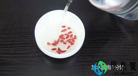 2、枸杞放入碗中,加水浸泡1分钟,清洗清洁后取出。