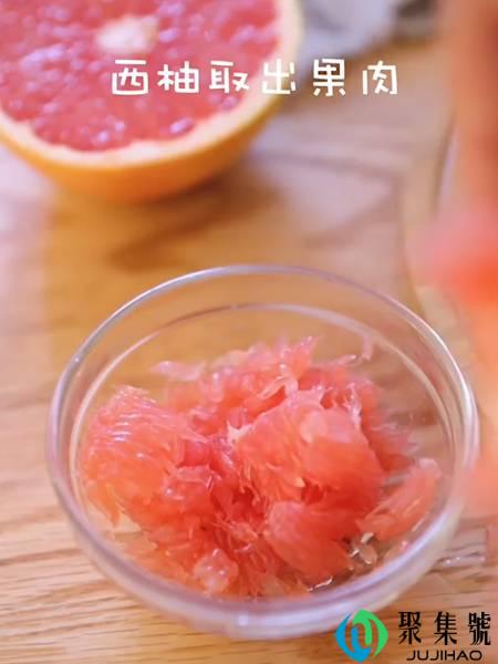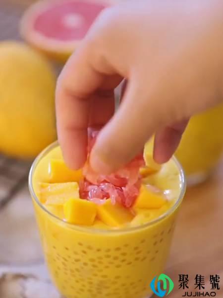 4、将西米放进杯子中,参加冷藏后的椰浆芒果,搅拌平均,放上芒果粒和西柚粒即可食用。