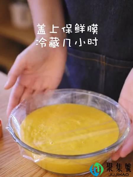 2、芒果块加椰浆、牛奶、白糖、打碎。倒进碗中,盖上保鲜膜,冷藏2小时。