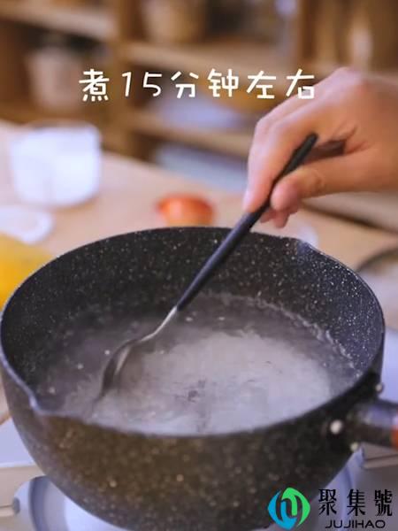3、锅中加水,水开后参加西米,煮15分钟摆布,煮到只要一点白芯,关火盖盖焖30分钟到通明,捞出过凉水。