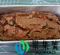 3、倒入肉丁和青椒,拌成平均面糊。倒入抹油的模具中,抹平外表。放入烤箱,中下层,上下火160度,烤约45分钟摆布。