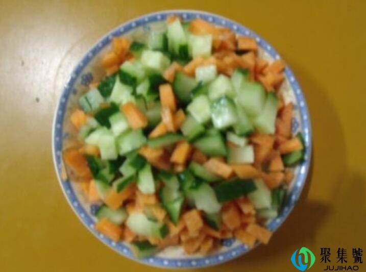 1、胡萝卜、黄瓜切成小丁放在盘子里备用。