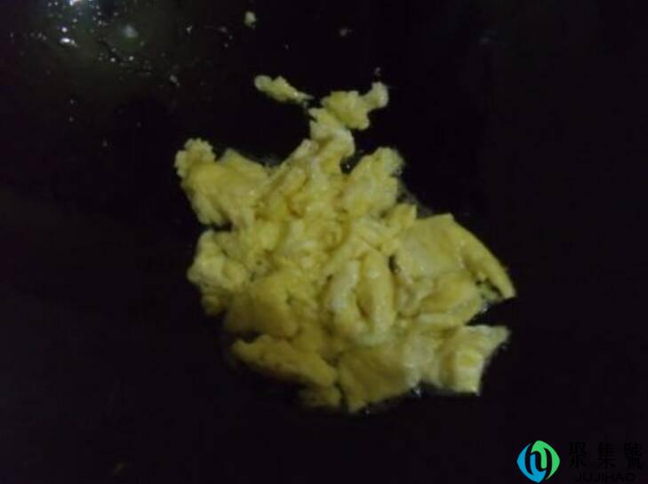 3、锅里放油,油热后倒入鸡蛋,翻炒,之后盛在盘子里备用。