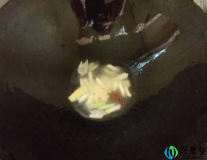 4、锅里放油,油热后参加葱花,八角,倒入酱油。