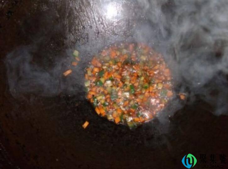 5、之后参加胡萝卜、黄瓜丁翻炒,参加适量的盐。