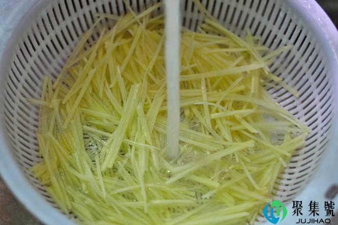 1、土豆去皮切成丝,用清水频频冲刷土豆丝淀粉至廓清,放在滤网中,摆在通风处,沥干水分。