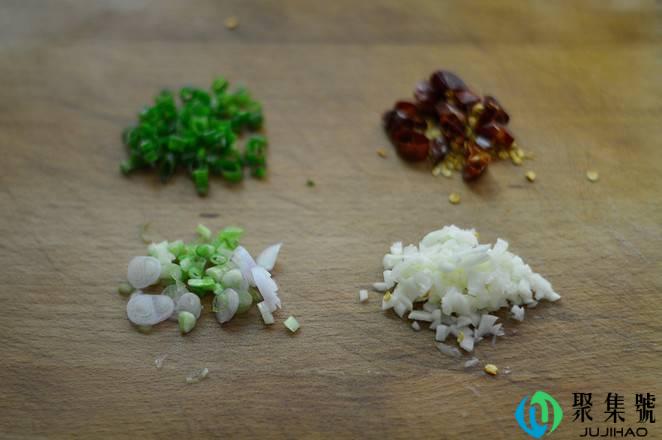 2、青椒切丝,葱白翠绿别离切末,干辣椒切段,蒜切碎沫。
