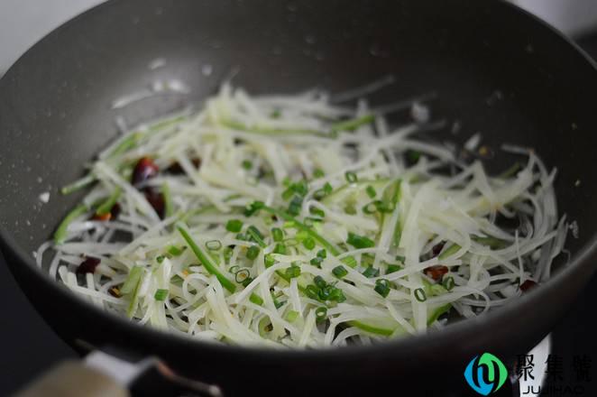 4、放入土豆丝,大火翻炒,淋入一汤匙白醋,炒匀。