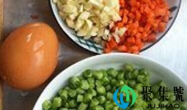 质料:豆角,肉丁,胡萝卜,鸡蛋。