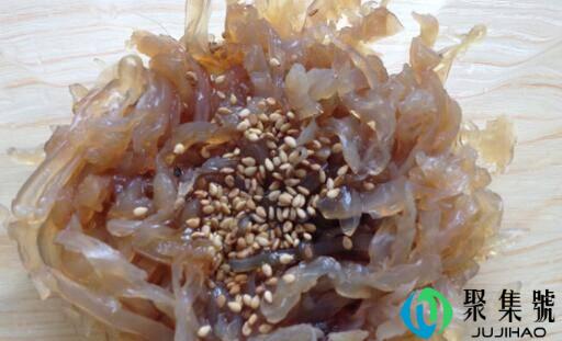 用料:海蜇头200克、盐2克、味极鲜酱油5克、醋适量、糖3克、葱花2克、芝麻油3克、花椒油2克、熟白芝麻3克。