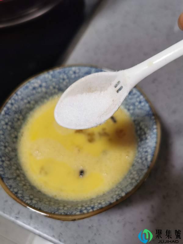 4、鸡蛋打入花甲肉里搅拌平均,参加少许盐,必然是少许盐哦,要否则就不鲜了。