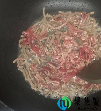 2、锅中倒入适量的油,烧至八成热,放入肉丝翻炒至肉变色。
