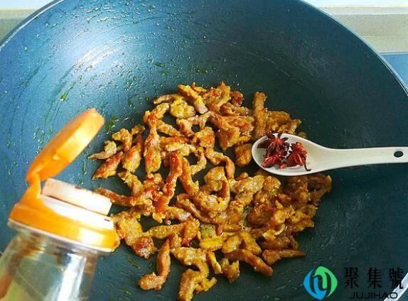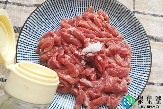 2、先将牛肉丝参加少量食盐、生抽、黄酒腌造入味10分钟。