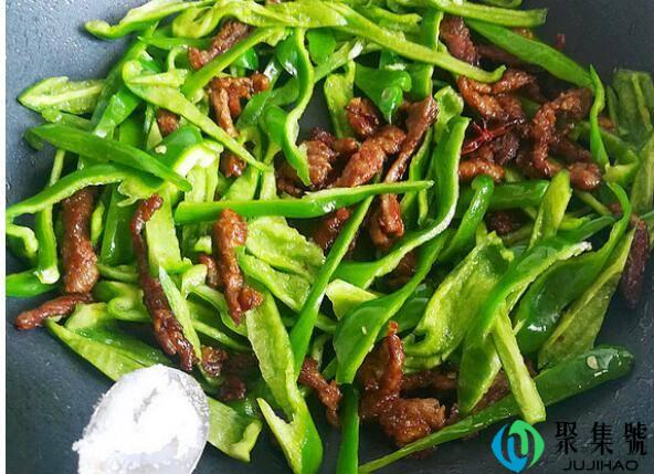 6、继续翻炒牛肉和青椒丝,再参加少许食盐调味。