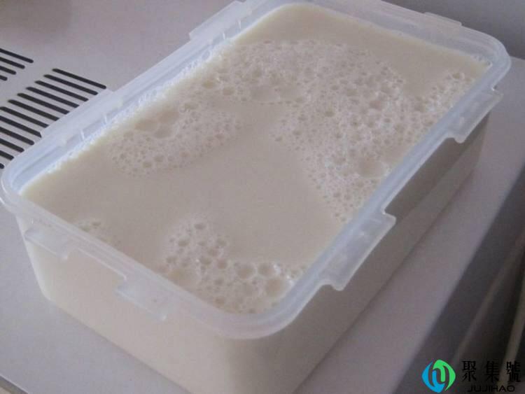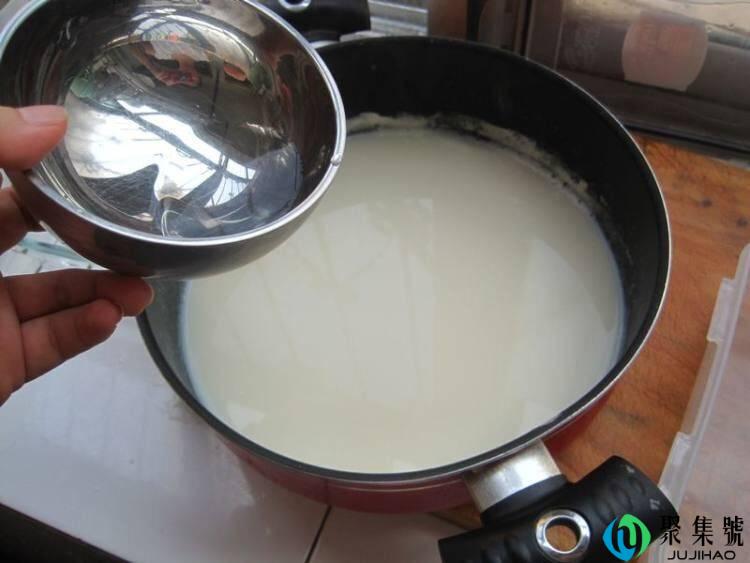 6、1.7~2克葡萄糖内酯用一点点开水融化后倒入豆浆内,快速搅拌平均。