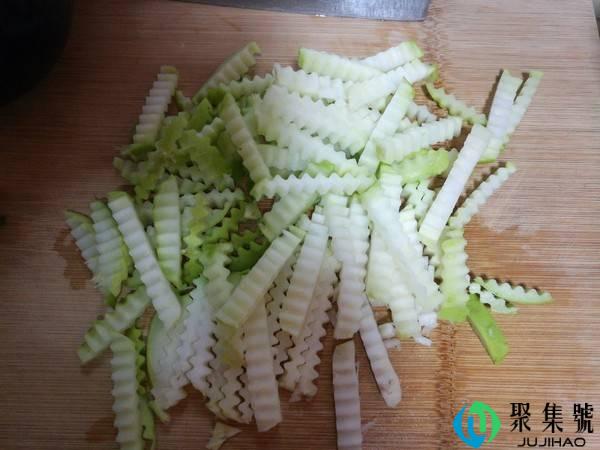 1、将苤蓝洗净去皮,用擦菜器切成条状。